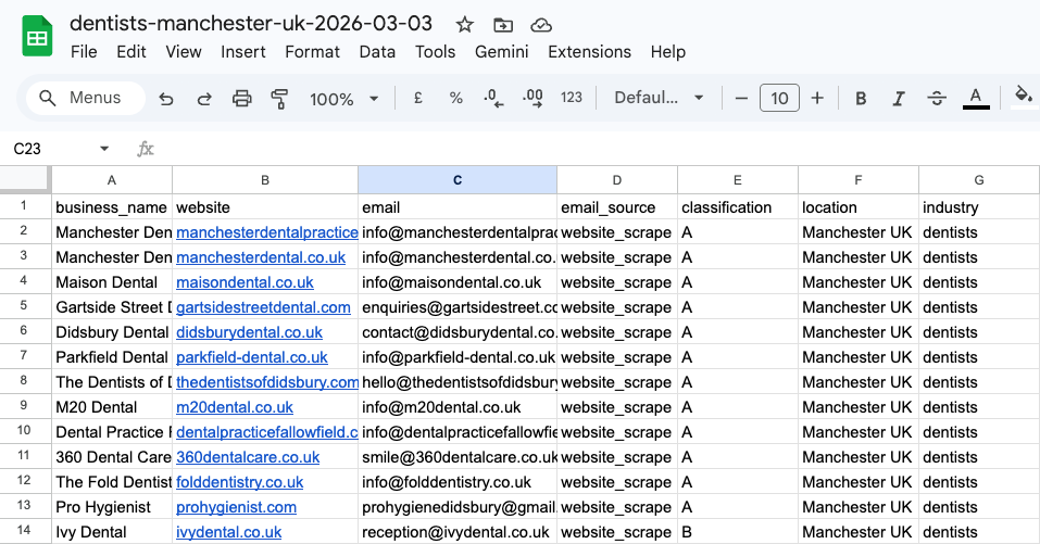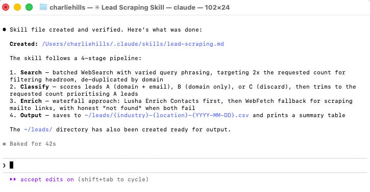 A skill that scrapes a target industry, classifies leads with AI, enriches contact emails, and uploads everything to a Google Sheet.