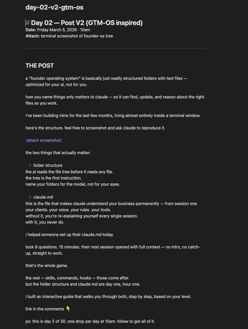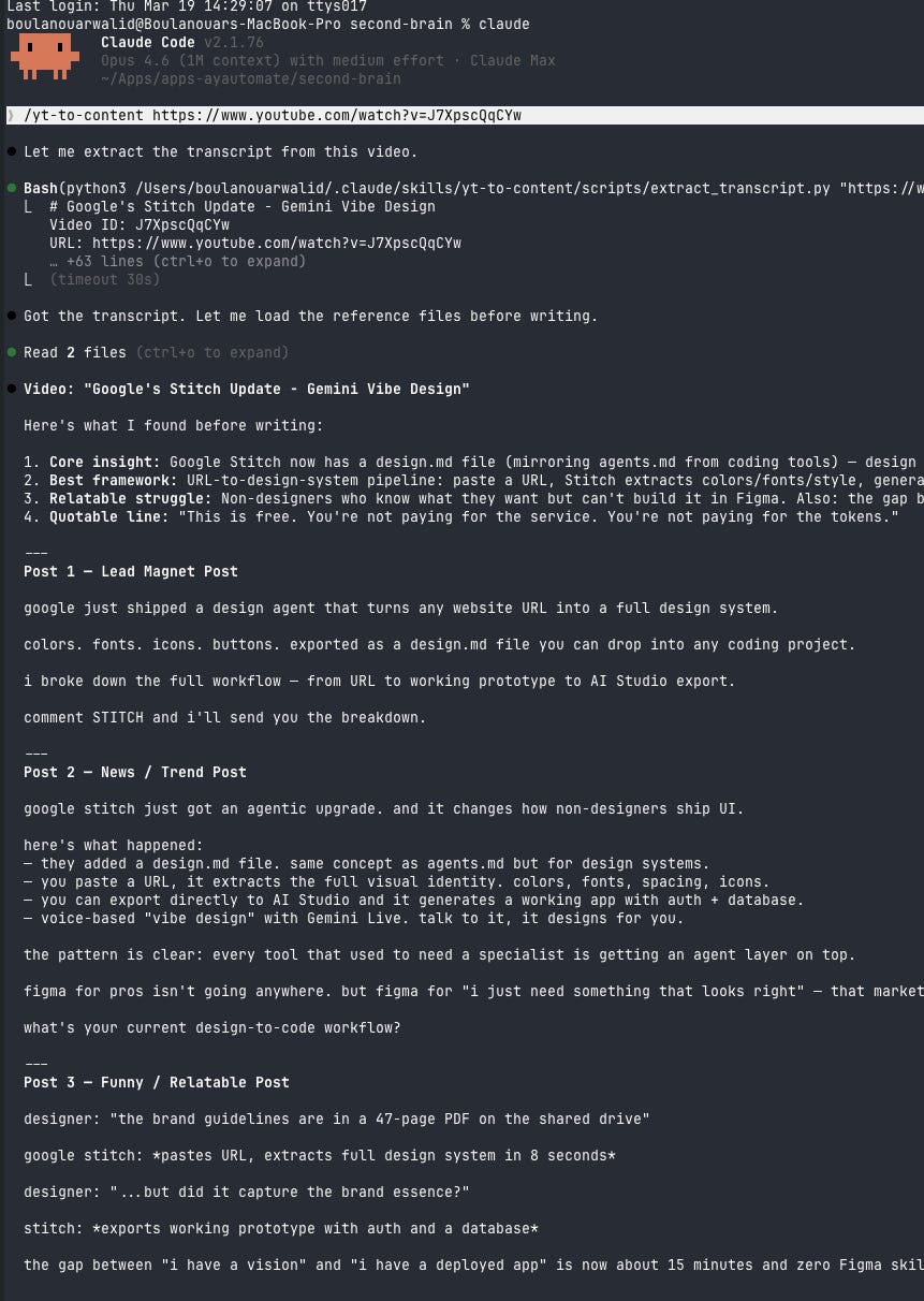 I ran a 30-day Claude Code content series this way. Every single post written, reviewed, and published from the terminal. The content calendar, the hooks, the visuals, the publishing. All one system. Something clicked around day 10 when I realised I was spending 20 minutes a day on content that used to take 2 hours.