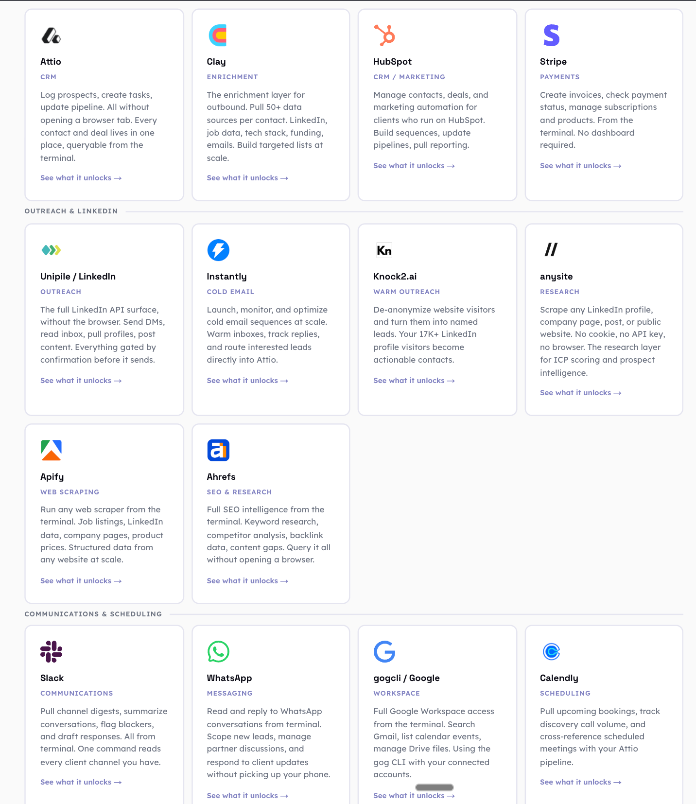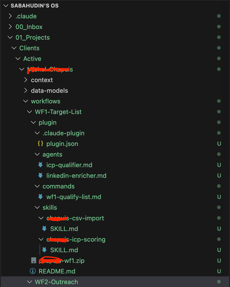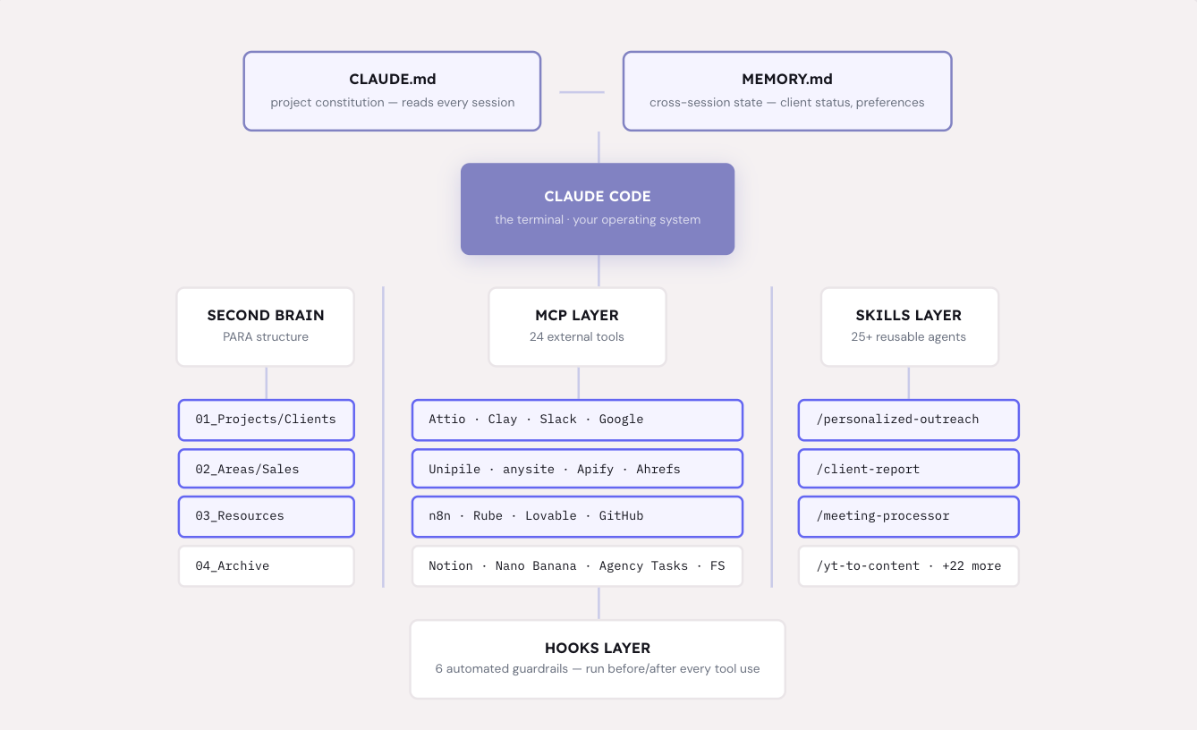 Here is what that looks like in practice. I type “research this prospect” and Claude Code pulls their LinkedIn profile via Unipile, checks if they exist in my CRM via Attio, scores them against my ICP, drafts a personalised message in my voice, and queues it for sending. One command. 5 systems. 30 seconds.