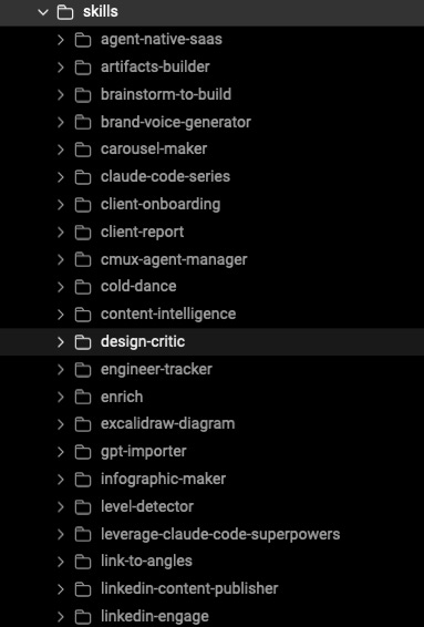 The thing that makes this different from a bunch of prompts: skills have memory. They know your preferences, your brand, your clients. The carousel-maker knows my colour palette and typography. The outreach skill knows my ICP and my tone. They get better the more context you feed them.