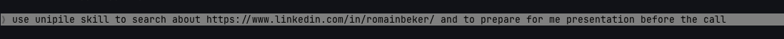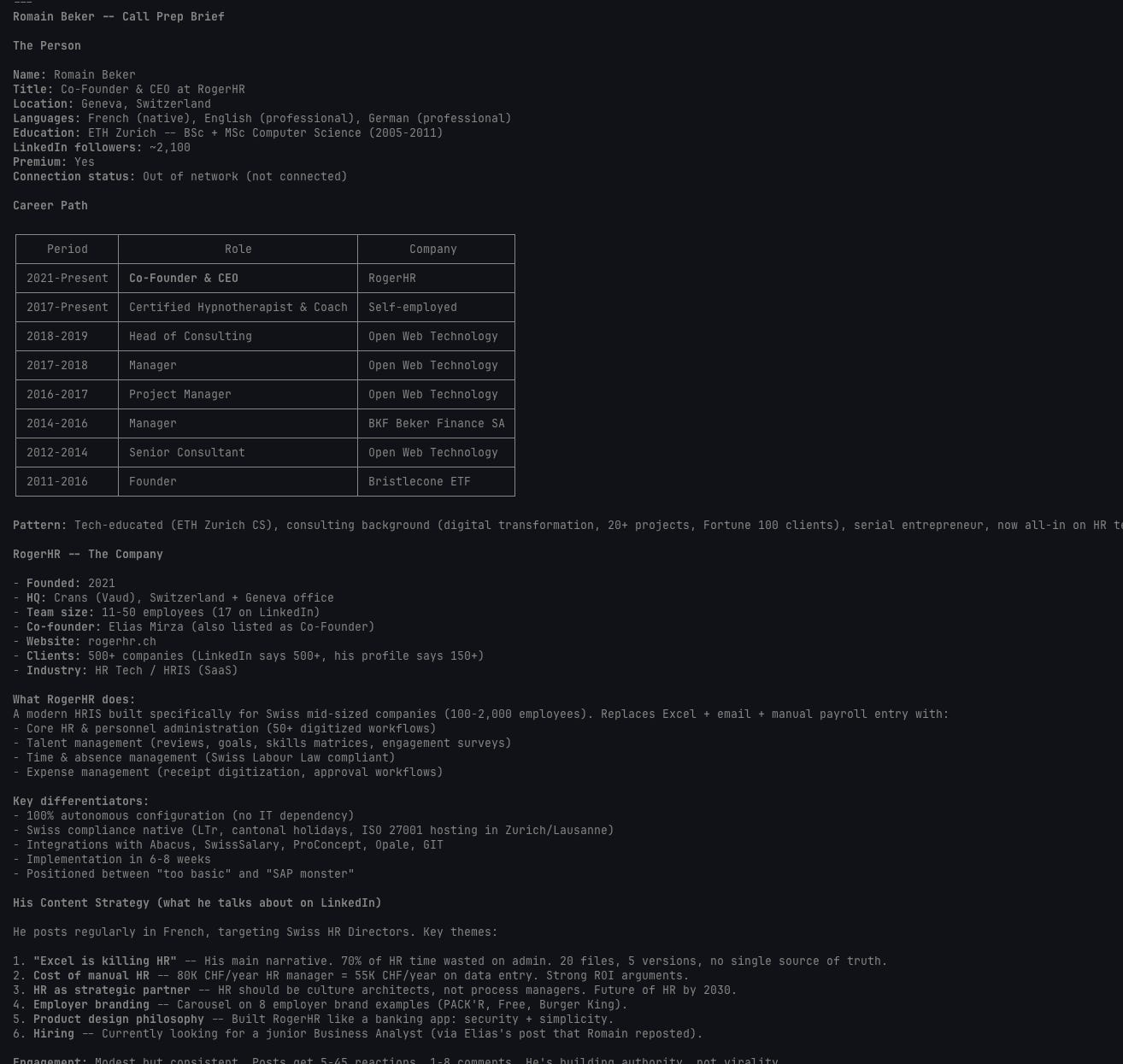 And because it has the second brain context, it knows which systems to check and in what order. For a prospect research task it checks the CRM first (in case we already talked to them), then LinkedIn, then the company website. That logic lives in the skill definition, not in my head.