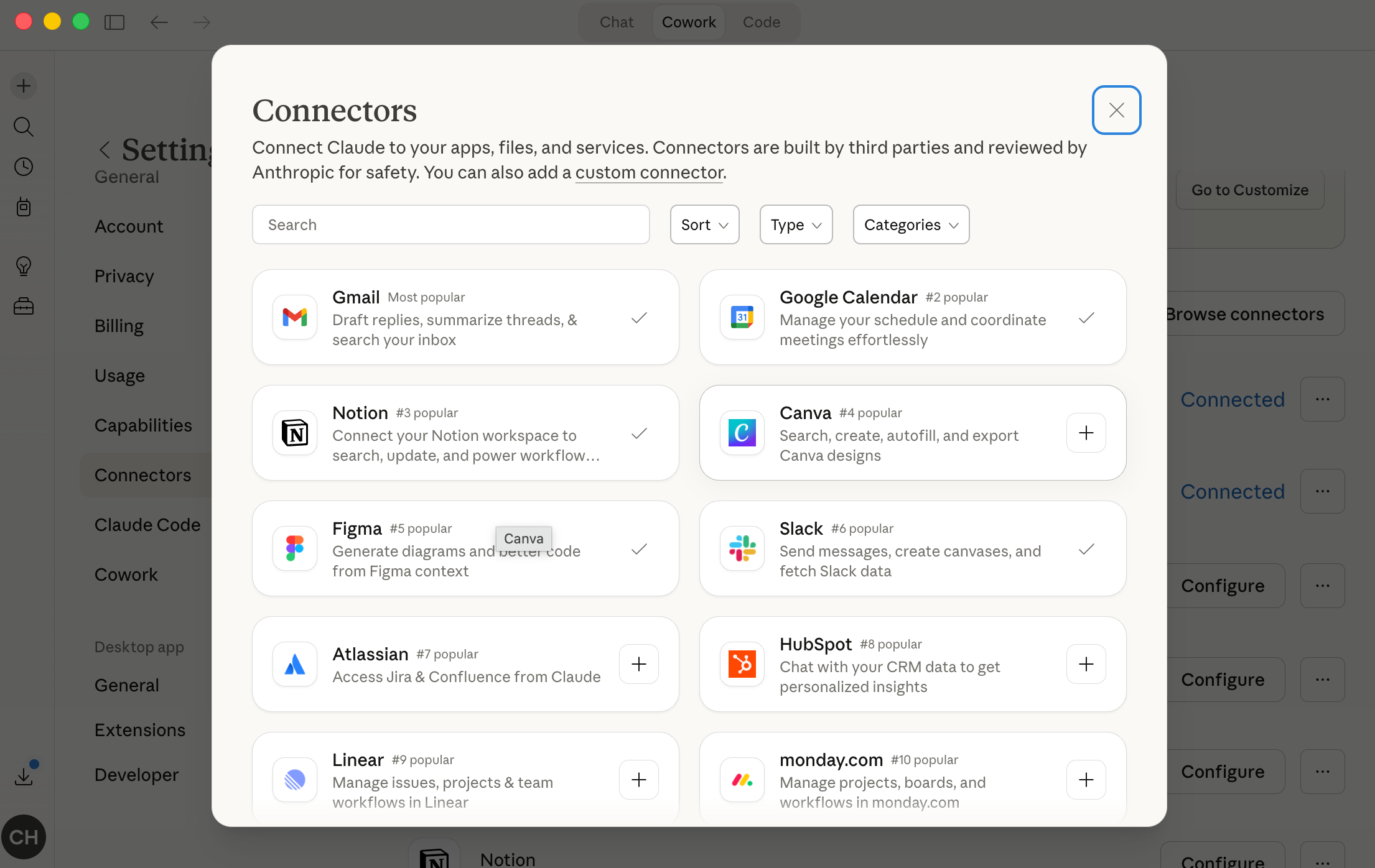 Go to Settings > Connectors in Claude Desktop. Over 50 integrations are listed. Authenticate once. Every future session picks them up automatically.