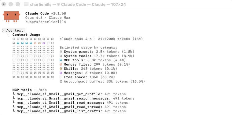 Run /context in any session to see exactly what is consuming your context window. You will see your system prompt, tools, MCP tools, memory files, skills, and messages with their exact token counts. Most people are surprised. Before they type a single message, they are often 15-20% through their window from system-level overhead alone.