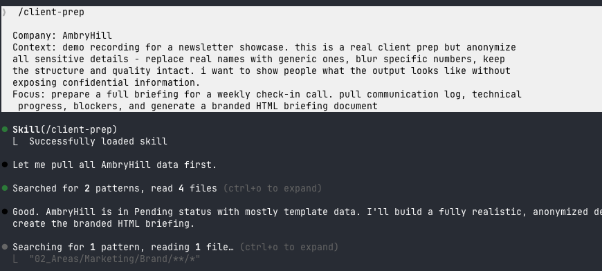 And this works for prospects too. When a prospect books a discovery call, I run the client-prep skill and it: