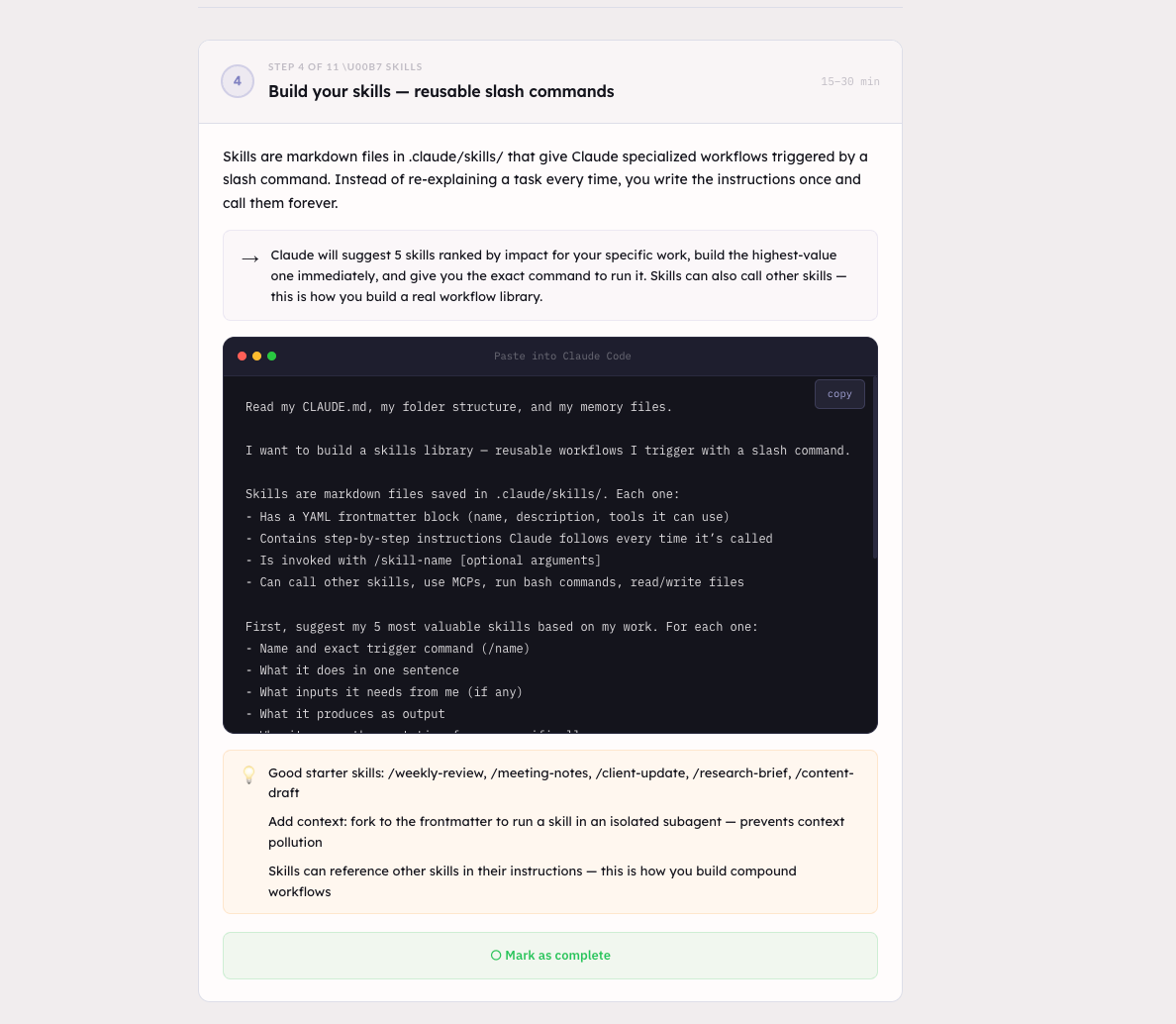 Here is what I want you to take away from this section. Every workflow you repeat more than twice should become a skill. And most of the skills you need already exist.